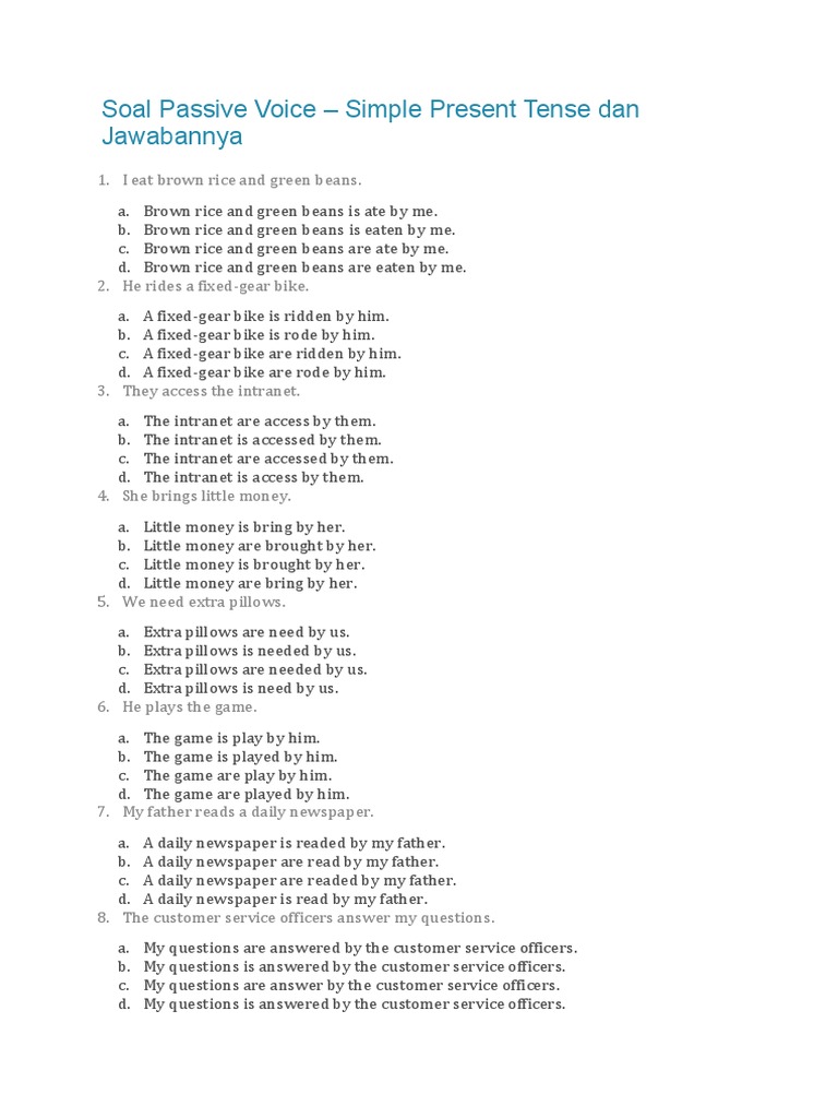 Oct 15, 2020 · soal passive voice terbaru dalam bentuk pilihan ganda dilengkapi kunci jawaban dan dapat di download gratis dalam bentuk file pdf.