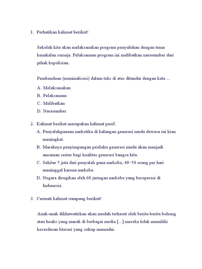 Soal pas bahasa indonesia kelas 9 semester 1 kurikulum 2013 revisi yang dibagikan pada artikel ini bisa diigunakan untuk keperluan pembelajaran. Saya kira cukup sampai di sini. Untuk soal hots mata pelajaran lain silahkan dilihat pada beberarapa link yang sudah kami tampilkan, soal hots bahasa indonesia smp kelas 9 k13. Bagi anda yang ingin mengetahui contoh soal teks. Menjaga kesehatan lebih utama dari pada memulihkan kesehatan. Topik kutipan pidato persuasif tersebut adalah… a. Kalau kita menyadari bahwa menjaga kesehatan lebih utama daripada memulihkan kesehatan, dan kalau kita yakin bahwa kebersihan adalah pangkal kesehatan, maka kalimat persuasif yang tepat untuk melengkapi penggalan pidato di atas adalah. Ilmubindo.com_ kali ini admin akan membagikan contoh soal pas kelas 9 materi pidato persuasif semester 1. Jangan lupa tetap bersama kami di rumusbilangan.com. Demikian yang dapat saya sampaikan, atas perhatiannya saya ucapkan terima kasih. Sehingga untuk menyampaikan pidato persuasif terdapat beberapa unsur. Berikut ini adalah contoh soal pilihan ganda tentang pidato kelas 9 beserta jawabannya. Itulah tadi kumpulan soal pidato persuasif pilihan ganda beserta jawaban kelas 9.