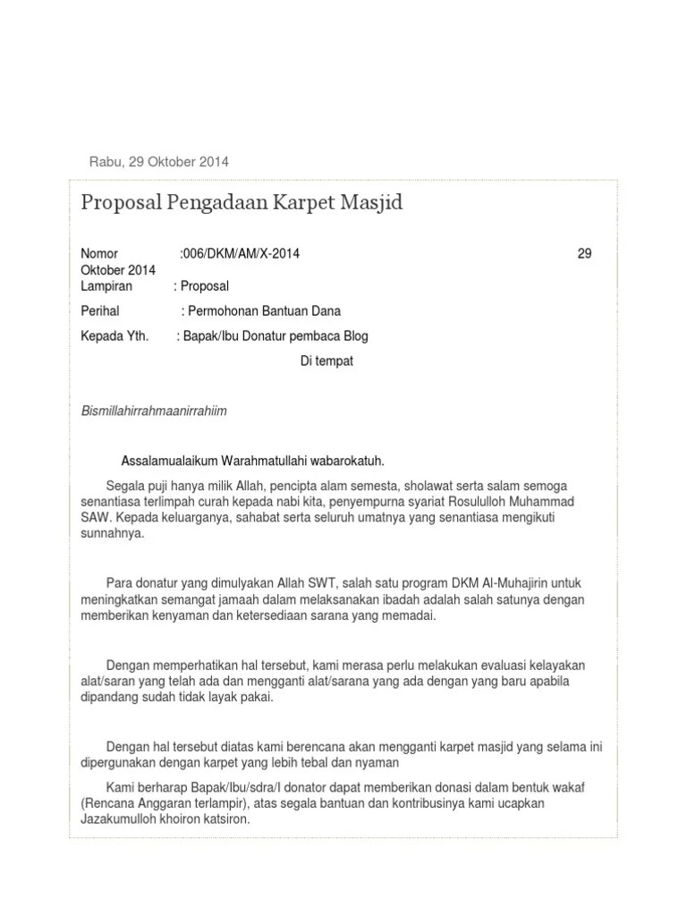 Permohonan pembangunan dan peralatan masjid. Bersama ini kami sampaikan proposal singkat (terlampir) ke hadapan bapak dan ibu, . Contoh proposal pengadaan barang masjid usulan pengadaan barang harus dilengkapi. Dari latarbelakang tersebut di atas kami berupaya memenuhi sarana prasarana pendidikan melalui proposal bantuan pengadaan sarana belajar smp yaitu mebuler. Mengger girang kelurahan pasirluyu kecamatan regol kota bandung.